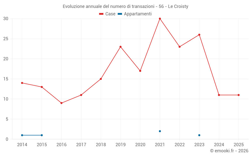 Il prezzo mediano sulle 16 transazioni di case degli ultimi 12 mesi nel comune di Le Croisty era di 1 038 € al metro quadrato per un valore patrimoniale mediano di 108 525 €. In questo periodo il 60% delle transazioni era tra 544 e 1 450 € al metro quadrato (dal 2° all'8° decile).