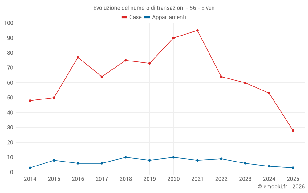 Il prezzo mediano sulle 28 transazioni di case degli ultimi 6 mesi nel comune di Elven era di 2 676 € al metro quadrato per un valore patrimoniale mediano di 258 750 €. In questo periodo il 60% delle transazioni era tra 2 295 e 3 036 € al metro quadrato (dal 2° all'8° decile).