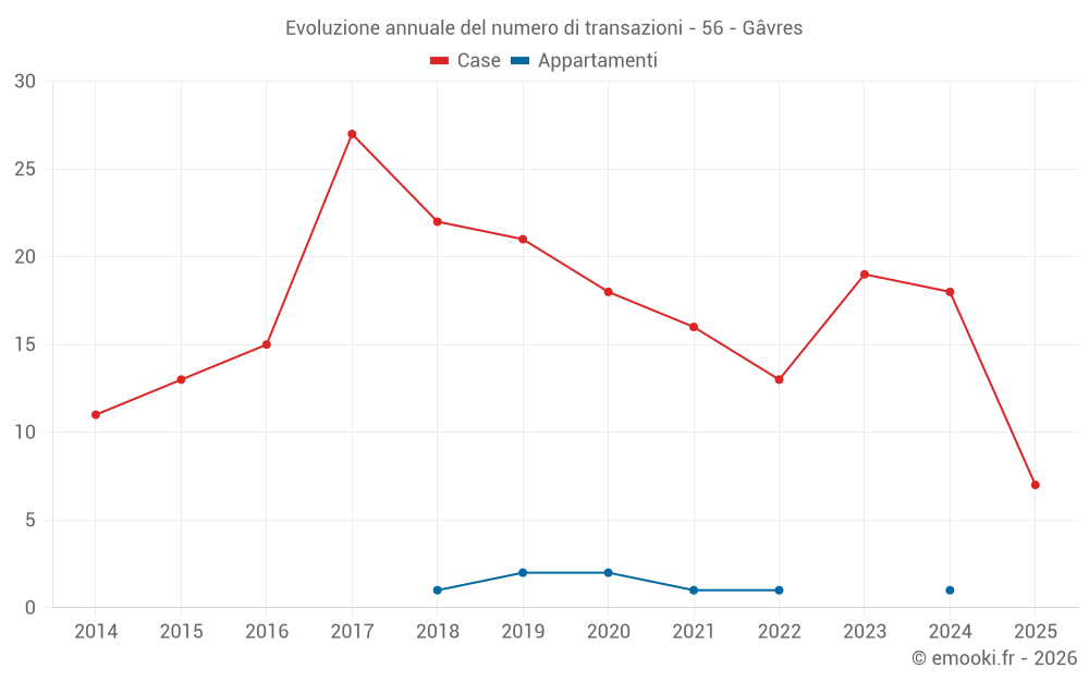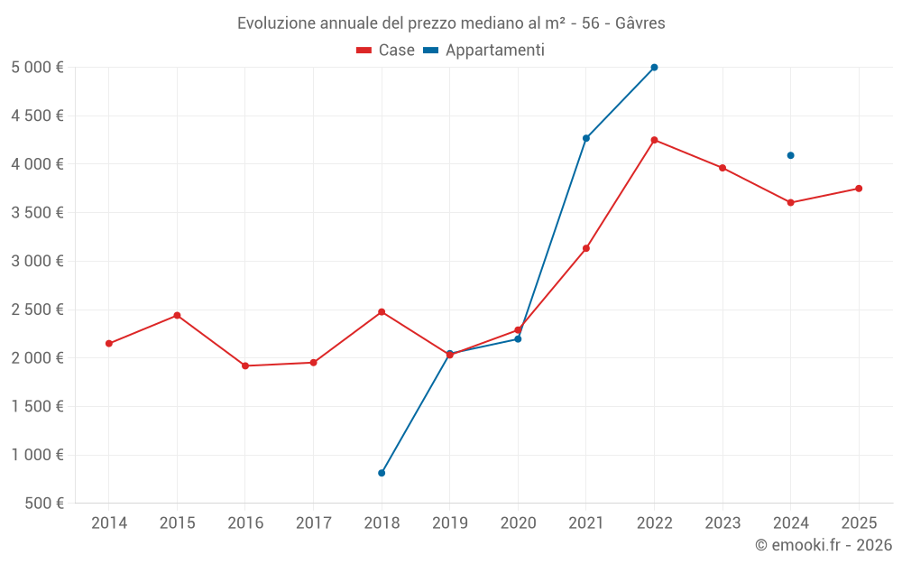 Il prezzo mediano sulle 19 transazioni di case degli ultimi 12 mesi nel comune di Gâvres era di 3 667 € al metro quadrato per un valore patrimoniale mediano di 240 000 €. In questo periodo il 60% delle transazioni era tra 2 285 e 4 793 € al metro quadrato (dal 2° all'8° decile).