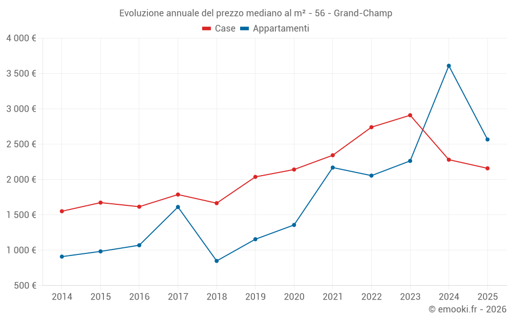 Il prezzo mediano sulle 23 transazioni di case degli ultimi 6 mesi nel comune di Grand-Champ era di 2 159 € al metro quadrato per un valore patrimoniale mediano di 211 200 €. In questo periodo il 60% delle transazioni era tra 1 638 e 3 202 € al metro quadrato (dal 2° all'8° decile).