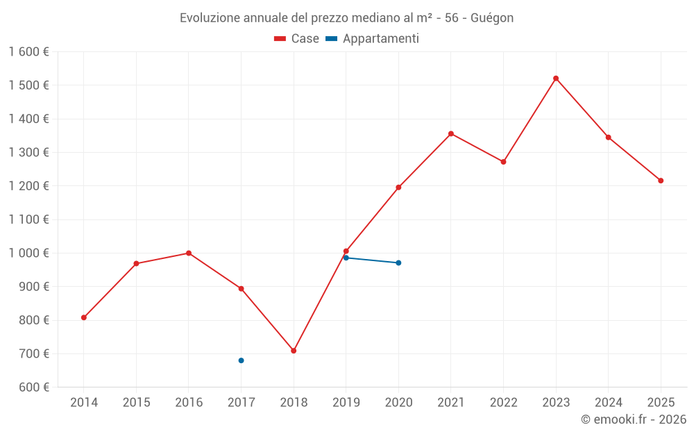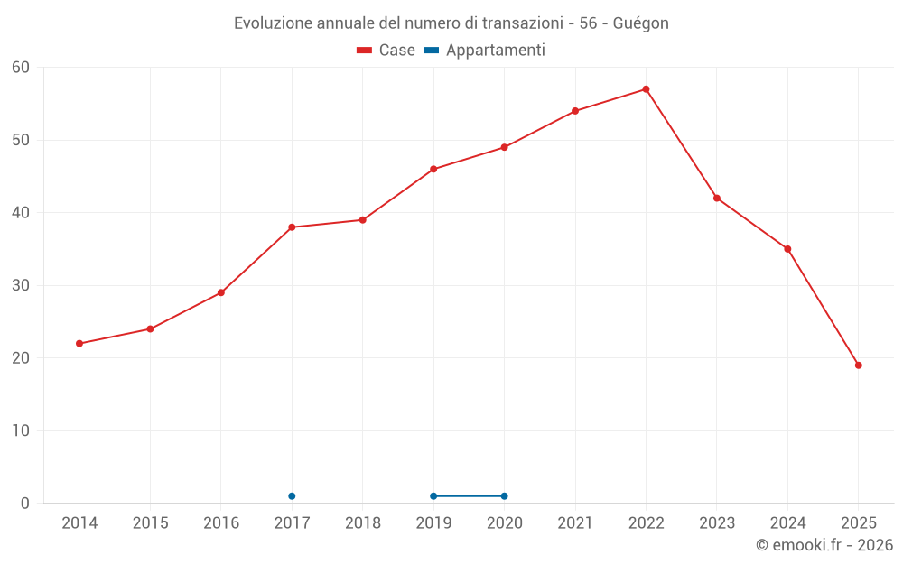Il prezzo mediano sulle 19 transazioni di case degli ultimi 6 mesi nel comune di Guégon era di 1 216 € al metro quadrato per un valore patrimoniale mediano di 100 000 €. In questo periodo il 60% delle transazioni era tra 757 e 1 567 € al metro quadrato (dal 2° all'8° decile).