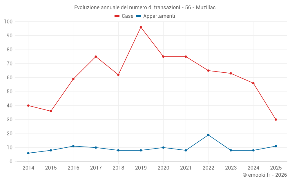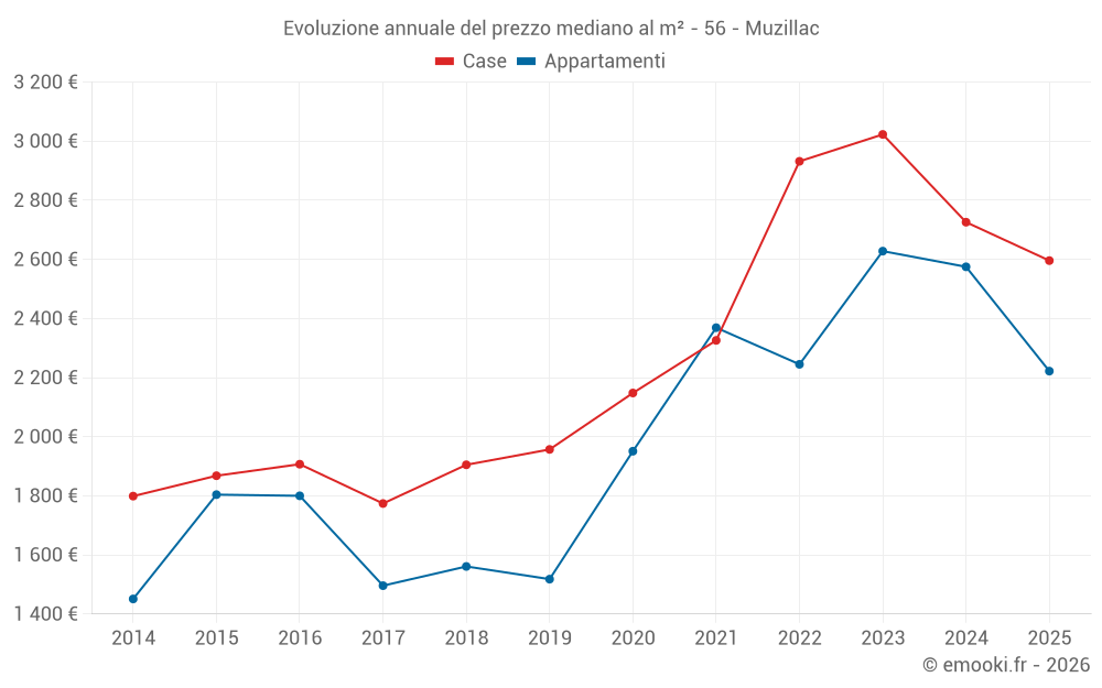 Il prezzo mediano sulle 30 transazioni di case degli ultimi 6 mesi nel comune di Muzillac era di 2 596 € al metro quadrato per un valore patrimoniale mediano di 217 500 €. In questo periodo il 60% delle transazioni era tra 1 438 e 3 261 € al metro quadrato (dal 2° all'8° decile).