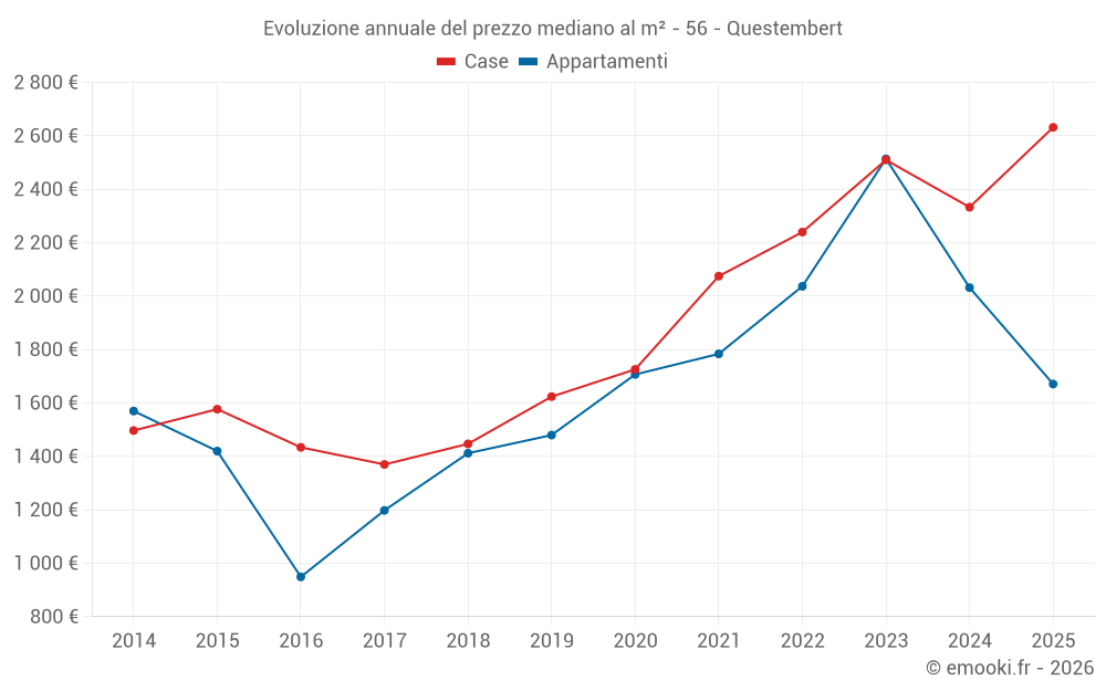 Il prezzo mediano sulle 39 transazioni di case degli ultimi 6 mesi nel comune di Questembert era di 2 632 € al metro quadrato per un valore patrimoniale mediano di 251 000 €. In questo periodo il 60% delle transazioni era tra 2 135 e 3 312 € al metro quadrato (dal 2° all'8° decile).