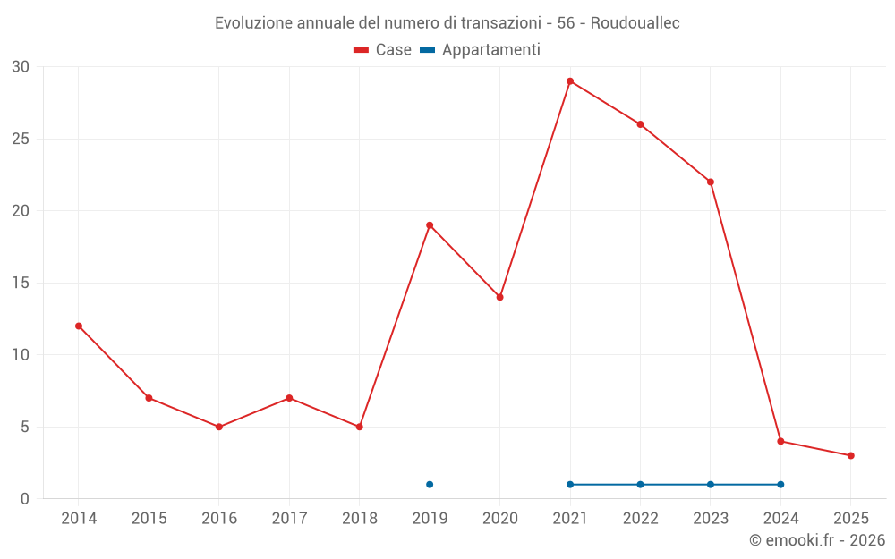 Il prezzo mediano sulle 19 transazioni di case degli ultimi 24 mesi nel comune di Roudouallec era di 1 271 € al metro quadrato per un valore patrimoniale mediano di 102 000 €. In questo periodo il 60% delle transazioni era tra 545 e 1 496 € al metro quadrato (dal 2° all'8° decile).
