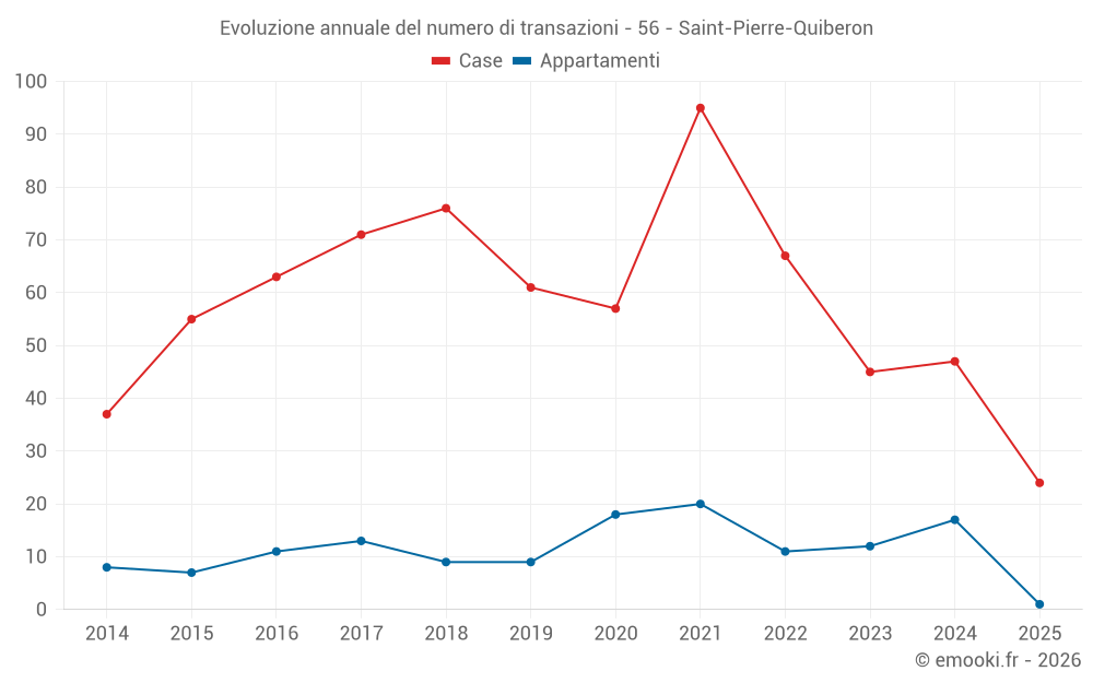 Il prezzo mediano sulle 25 transazioni di appartamenti degli ultimi 24 mesi nel comune di Saint-Pierre-Quiberon era di 5 295 € al metro quadrato per un valore patrimoniale mediano di 240 700 €. In questo periodo il 60% delle transazioni era tra 3 309 e 6 920 € al metro quadrato (dal 2° all'8° decile).