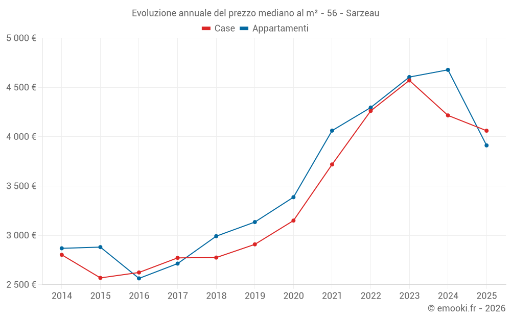 Il prezzo mediano sulle 24 transazioni di appartamenti degli ultimi 6 mesi nel comune di Sarzeau era di 3 912 € al metro quadrato per un valore patrimoniale mediano di 187 500 €. In questo periodo il 60% delle transazioni era tra 2 805 e 5 214 € al metro quadrato (dal 2° all'8° decile).