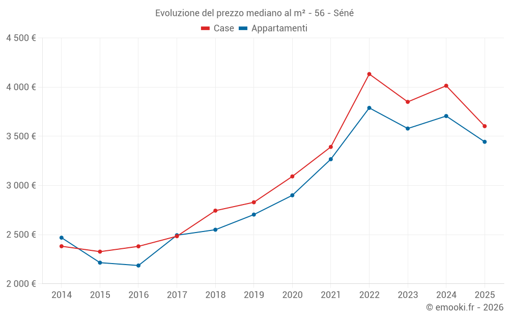 Il prezzo mediano sulle 34 transazioni di appartamenti degli ultimi 12 mesi nel comune di Séné era di 3 646 € al metro quadrato per un valore patrimoniale mediano di 159 302 €. In questo periodo il 60% delle transazioni era tra 3 128 e 4 186 € al metro quadrato (dal 2° all'8° decile).