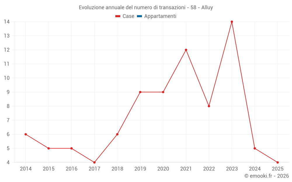 Il prezzo mediano sulle 16 transazioni di case degli ultimi 24 mesi nel comune di Alluy era di 790 € al metro quadrato per un valore patrimoniale mediano di 60 250 €. In questo periodo il 60% delle transazioni era tra 504 e 1 529 € al metro quadrato (dal 2° all'8° decile).