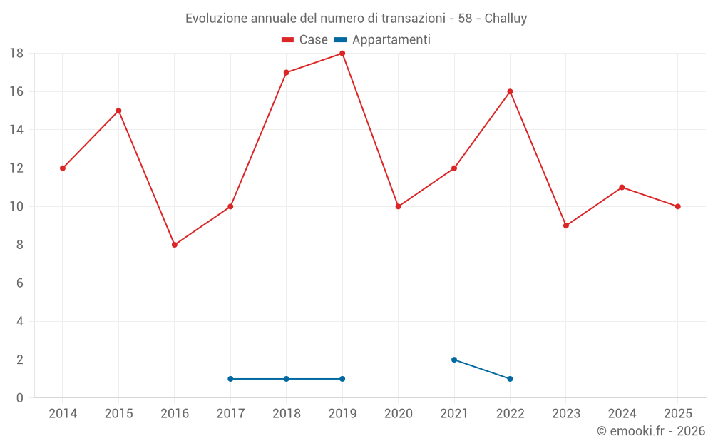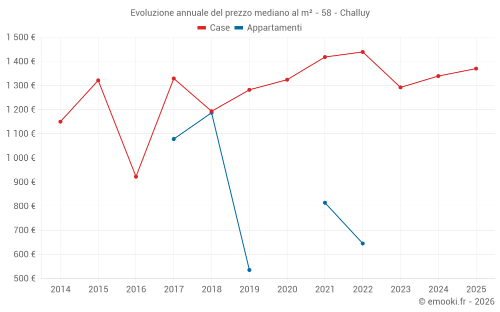 Il prezzo mediano sulle 16 transazioni di case degli ultimi 12 mesi nel comune di Challuy era di 1 294 € al metro quadrato per un valore patrimoniale mediano di 123 600 €. In questo periodo il 60% delle transazioni era tra 900 e 1 648 € al metro quadrato (dal 2° all'8° decile).