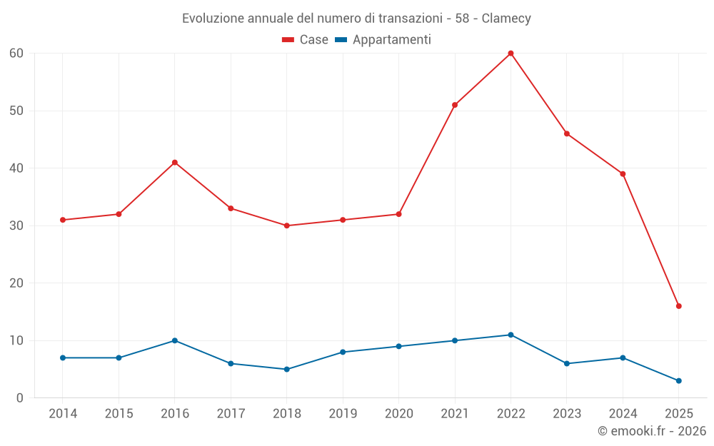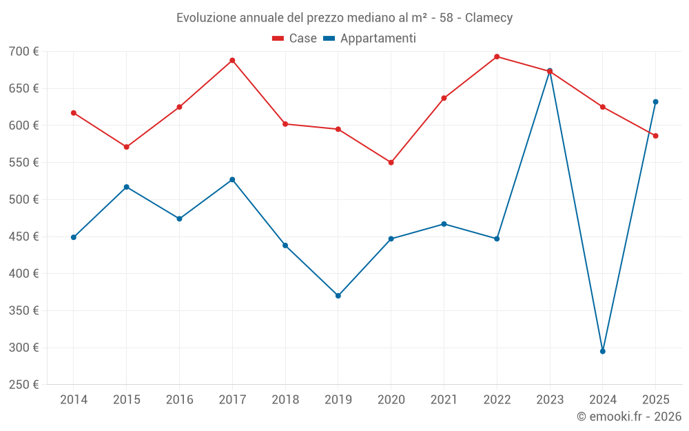 Il prezzo mediano sulle 15 transazioni di appartamenti degli ultimi 24 mesi nel comune di Clamecy era di 632 € al metro quadrato per un valore patrimoniale mediano di 38 000 €. In questo periodo il 60% delle transazioni era tra 265 e 716 € al metro quadrato (dal 2° all'8° decile).