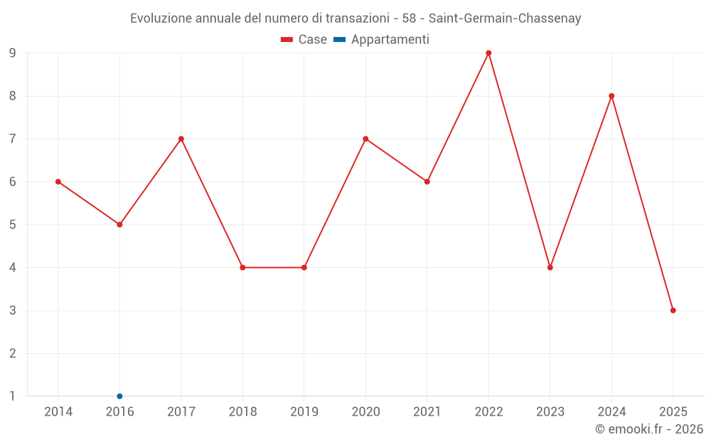 Il prezzo mediano sulle 14 transazioni di case degli ultimi 24 mesi nel comune di Saint-Germain-Chassenay era di 850 € al metro quadrato per un valore patrimoniale mediano di 72 500 €. In questo periodo il 60% delle transazioni era tra 533 e 1 358 € al metro quadrato (dal 2° all'8° decile).
