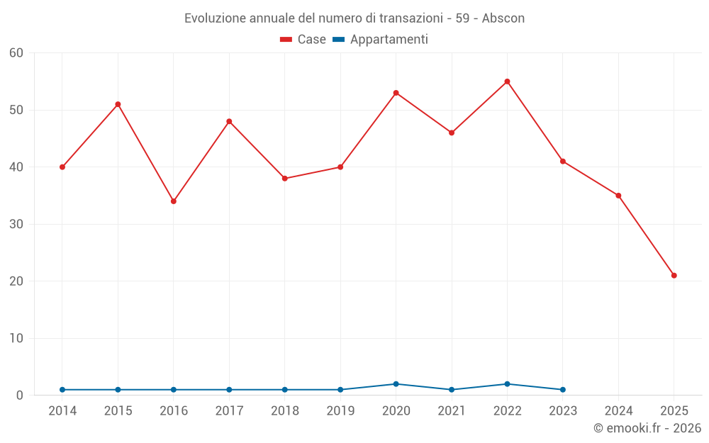 Il prezzo mediano sulle 21 transazioni di case degli ultimi 6 mesi nel comune di Abscon era di 1 346 € al metro quadrato per un valore patrimoniale mediano di 150 600 €. In questo periodo il 60% delle transazioni era tra 895 e 1 982 € al metro quadrato (dal 2° all'8° decile).