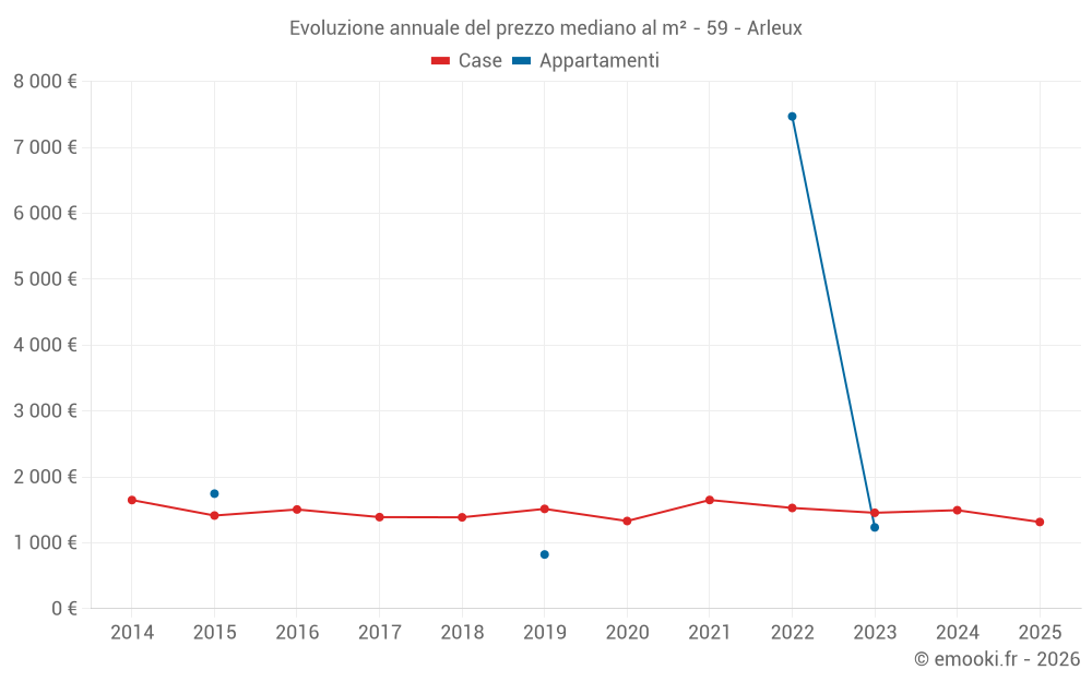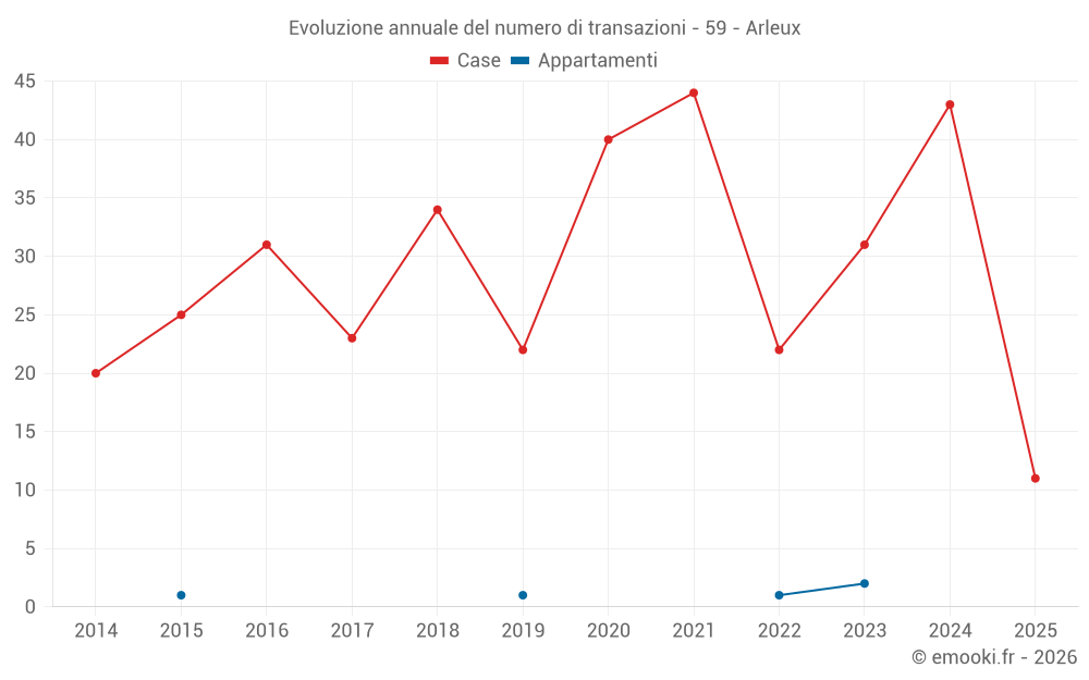 Il prezzo mediano sulle 36 transazioni di case degli ultimi 12 mesi nel comune di Arleux era di 1 347 € al metro quadrato per un valore patrimoniale mediano di 122 975 €. In questo periodo il 60% delle transazioni era tra 980 e 1 714 € al metro quadrato (dal 2° all'8° decile).