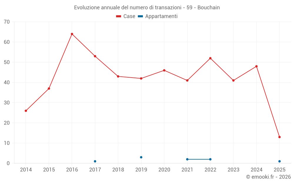Il prezzo mediano sulle 41 transazioni di case degli ultimi 12 mesi nel comune di Bouchain era di 1 571 € al metro quadrato per un valore patrimoniale mediano di 135 000 €. In questo periodo il 60% delle transazioni era tra 1 194 e 2 065 € al metro quadrato (dal 2° all'8° decile).