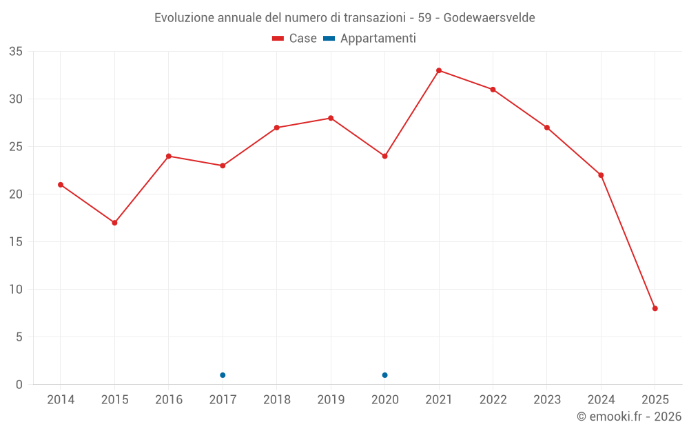 Il prezzo mediano sulle 19 transazioni di case degli ultimi 12 mesi nel comune di Godewaersvelde era di 2 059 € al metro quadrato per un valore patrimoniale mediano di 199 000 €. In questo periodo il 60% delle transazioni era tra 1 445 e 2 438 € al metro quadrato (dal 2° all'8° decile).