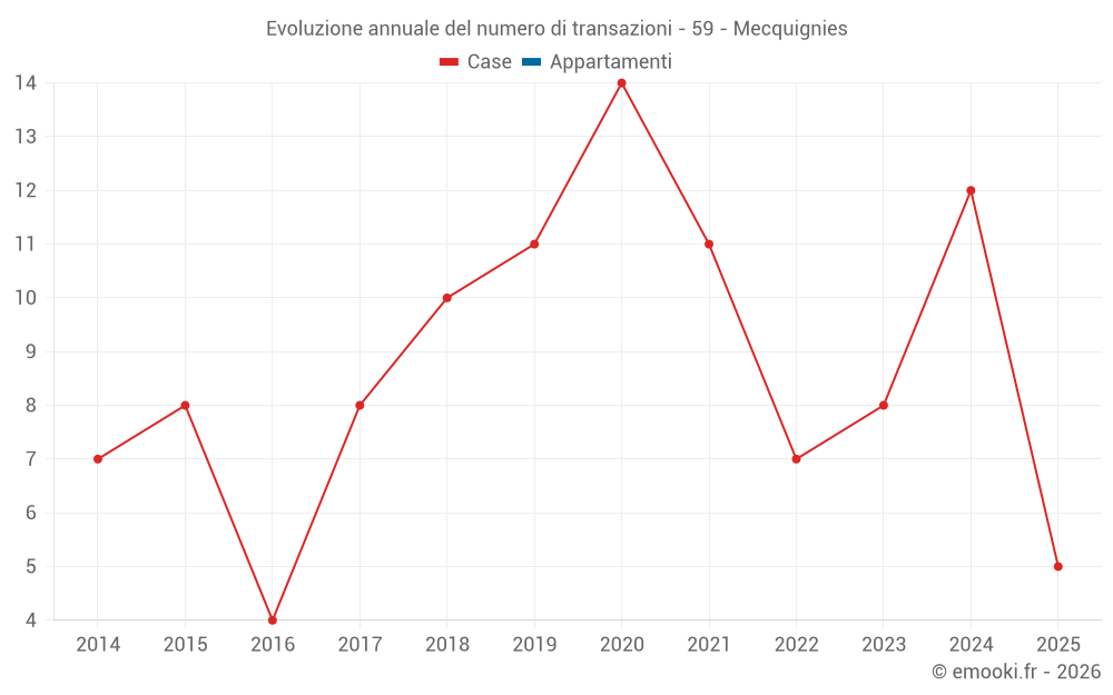 Il prezzo mediano sulle 19 transazioni di case degli ultimi 24 mesi nel comune di Mecquignies era di 1 309 € al metro quadrato per un valore patrimoniale mediano di 163 500 €. In questo periodo il 60% delle transazioni era tra 955 e 2 552 € al metro quadrato (dal 2° all'8° decile).
