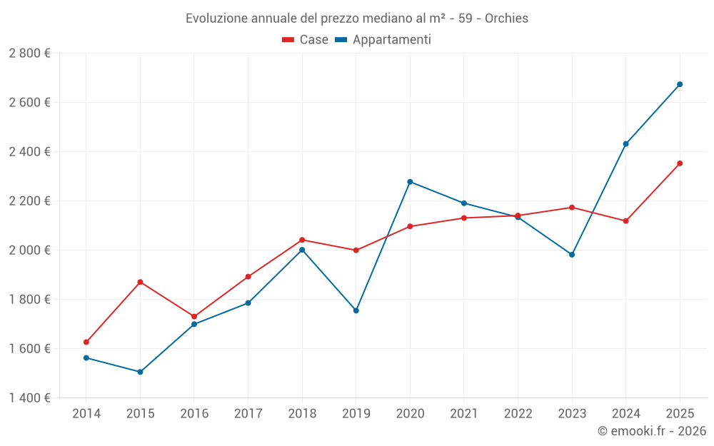 Il prezzo mediano sulle 23 transazioni di appartamenti degli ultimi 24 mesi nel comune di Orchies era di 2 357 € al metro quadrato per un valore patrimoniale mediano di 129 500 €. In questo periodo il 60% delle transazioni era tra 1 753 e 2 706 € al metro quadrato (dal 2° all'8° decile).
