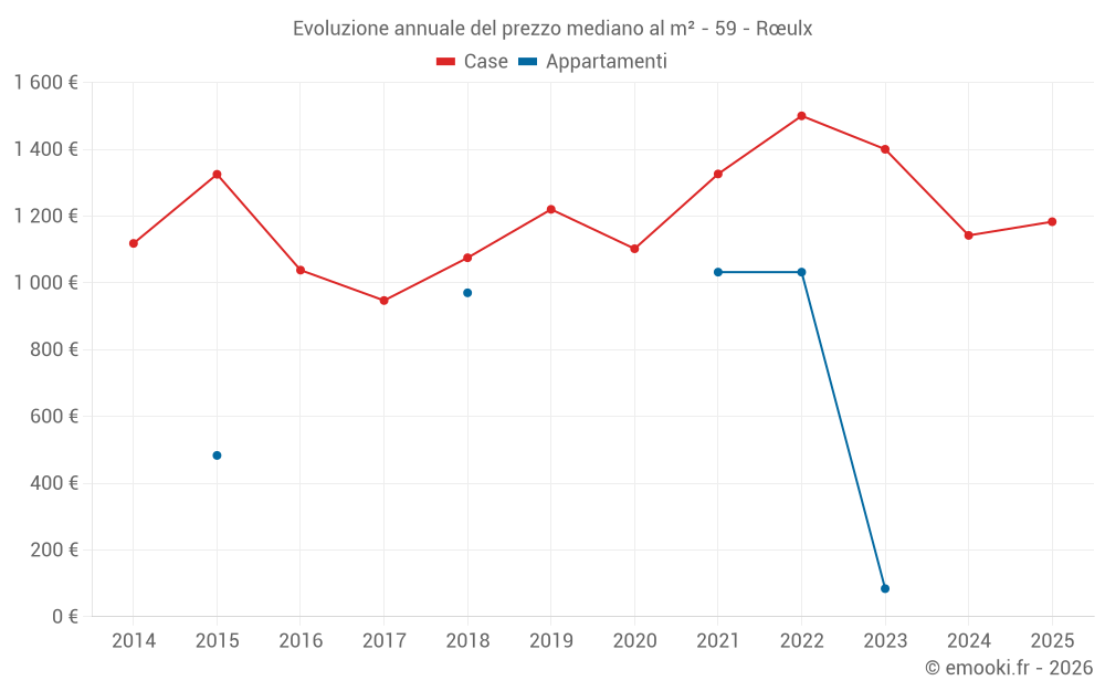 Il prezzo mediano sulle 25 transazioni di case degli ultimi 12 mesi nel comune di Rœulx era di 1 183 € al metro quadrato per un valore patrimoniale mediano di 103 000 €. In questo periodo il 60% delle transazioni era tra 934 e 1 371 € al metro quadrato (dal 2° all'8° decile).