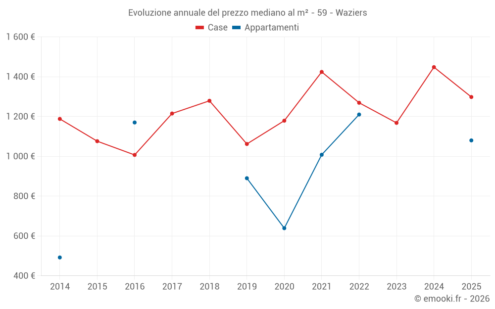 Il prezzo mediano sulle 24 transazioni di case degli ultimi 6 mesi nel comune di Waziers era di 1 298 € al metro quadrato per un valore patrimoniale mediano di 152 250 €. In questo periodo il 60% delle transazioni era tra 970 e 1 609 € al metro quadrato (dal 2° all'8° decile).