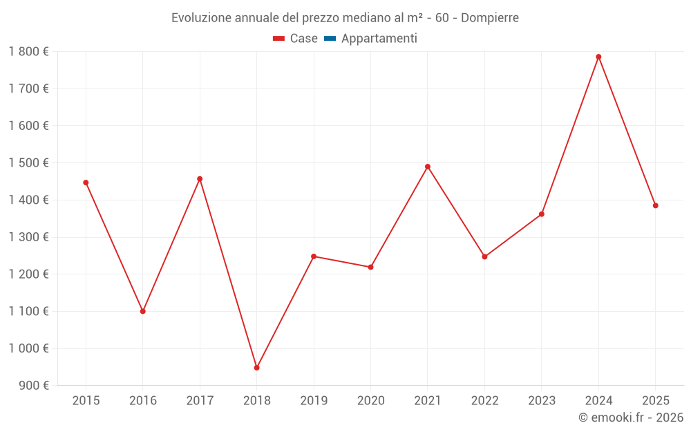 Il prezzo mediano sulle 14 transazioni di case degli ultimi 24 mesi nel comune di Dompierre era di 1 442 € al metro quadrato per un valore patrimoniale mediano di 134 500 €. In questo periodo il 60% delle transazioni era tra 1 252 e 1 836 € al metro quadrato (dal 2° all'8° decile).