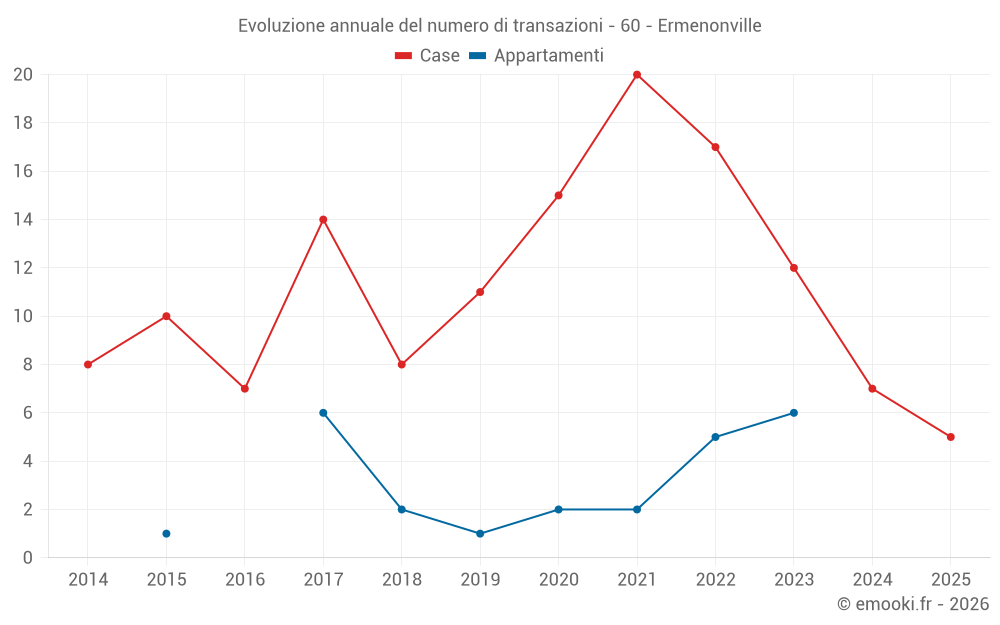 Il prezzo mediano sulle 16 transazioni di case degli ultimi 24 mesi nel comune di Ermenonville era di 2 758 € al metro quadrato per un valore patrimoniale mediano di 373 500 €. In questo periodo il 60% delle transazioni era tra 2 347 e 3 375 € al metro quadrato (dal 2° all'8° decile).