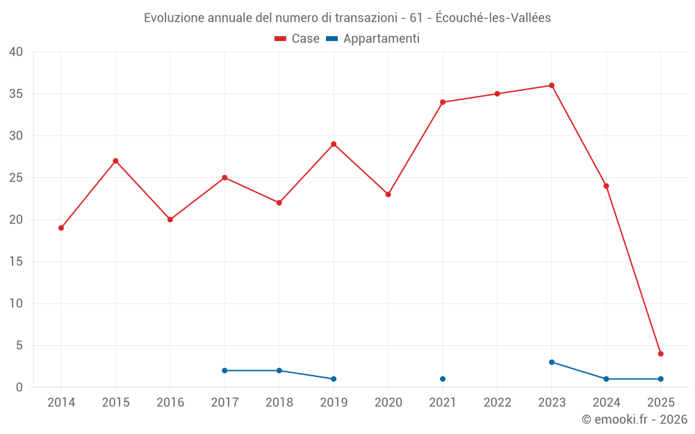 Il prezzo mediano sulle 19 transazioni di case degli ultimi 12 mesi nel comune di Écouché-les-Vallées era di 1 486 € al metro quadrato per un valore patrimoniale mediano di 124 000 €. In questo periodo il 60% delle transazioni era tra 741 e 1 790 € al metro quadrato (dal 2° all'8° decile).