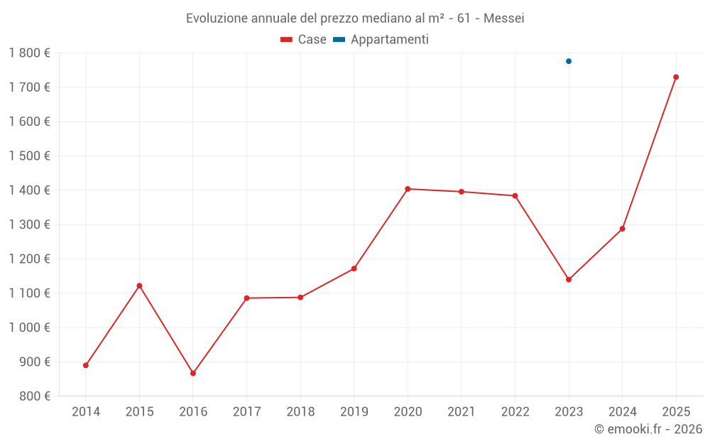 Il prezzo mediano sulle 29 transazioni di case degli ultimi 12 mesi nel comune di Messei era di 1 499 € al metro quadrato per un valore patrimoniale mediano di 128 000 €. In questo periodo il 60% delle transazioni era tra 1 243 e 2 061 € al metro quadrato (dal 2° all'8° decile).