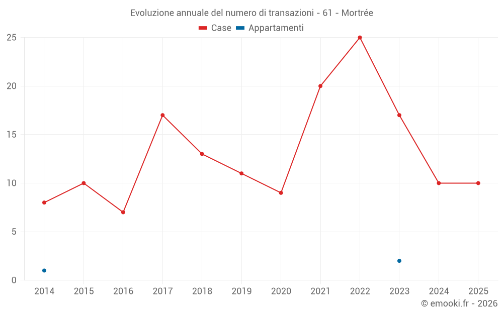 Il prezzo mediano sulle 28 transazioni di case degli ultimi 24 mesi nel comune di Mortrée era di 888 € al metro quadrato per un valore patrimoniale mediano di 80 000 €. In questo periodo il 60% delle transazioni era tra 555 e 1 636 € al metro quadrato (dal 2° all'8° decile).