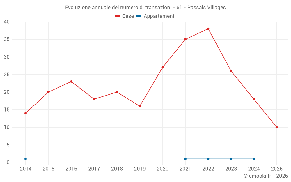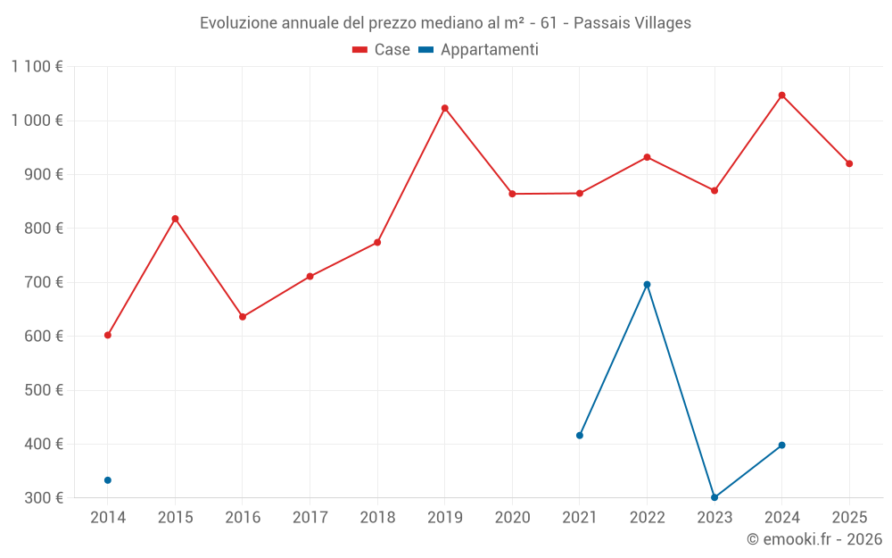 Il prezzo mediano sulle 22 transazioni di case degli ultimi 12 mesi nel comune di Passais Villages era di 920 € al metro quadrato per un valore patrimoniale mediano di 87 500 €. In questo periodo il 60% delle transazioni era tra 686 e 1 267 € al metro quadrato (dal 2° all'8° decile).