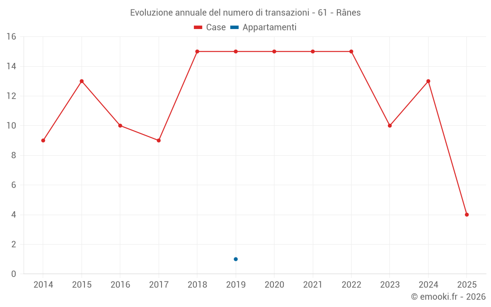 Il prezzo mediano sulle 22 transazioni di case degli ultimi 24 mesi nel comune di Rânes era di 1 300 € al metro quadrato per un valore patrimoniale mediano di 104 000 €. In questo periodo il 60% delle transazioni era tra 859 e 1 807 € al metro quadrato (dal 2° all'8° decile).