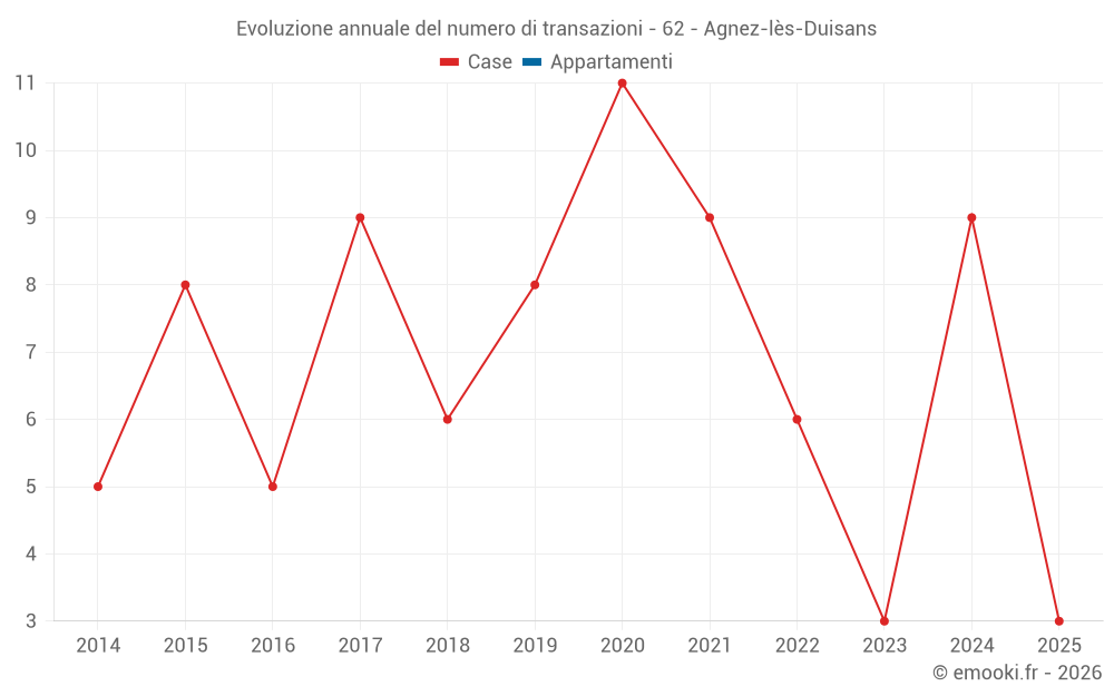 Il prezzo mediano sulle 14 transazioni di case degli ultimi 24 mesi nel comune di Agnez-lès-Duisans era di 1 872 € al metro quadrato per un valore patrimoniale mediano di 192 500 €. In questo periodo il 60% delle transazioni era tra 1 473 e 2 220 € al metro quadrato (dal 2° all'8° decile).