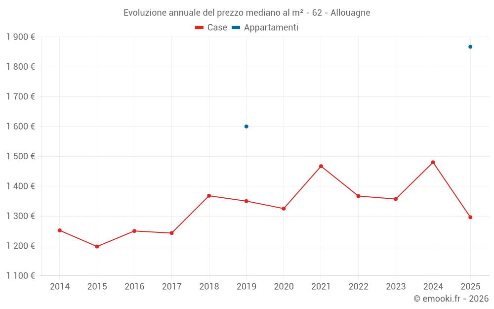 Il prezzo mediano sulle 24 transazioni di case degli ultimi 12 mesi nel comune di Allouagne era di 1 397 € al metro quadrato per un valore patrimoniale mediano di 137 800 €. In questo periodo il 60% delle transazioni era tra 942 e 2 026 € al metro quadrato (dal 2° all'8° decile).