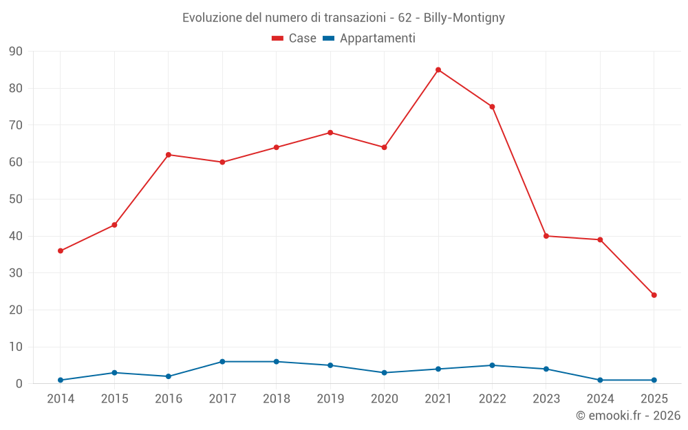 Il prezzo mediano sulle 24 transazioni di case degli ultimi 6 mesi nel comune di Billy-Montigny era di 1 346 € al metro quadrato per un valore patrimoniale mediano di 117 125 €. In questo periodo il 60% delle transazioni era tra 1 072 e 1 736 € al metro quadrato (dal 2° all'8° decile).
