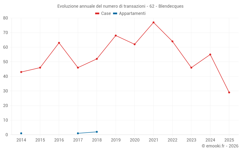 Il prezzo mediano sulle 29 transazioni di case degli ultimi 6 mesi nel comune di Blendecques era di 1 431 € al metro quadrato per un valore patrimoniale mediano di 124 460 €. In questo periodo il 60% delle transazioni era tra 989 e 2 231 € al metro quadrato (dal 2° all'8° decile).