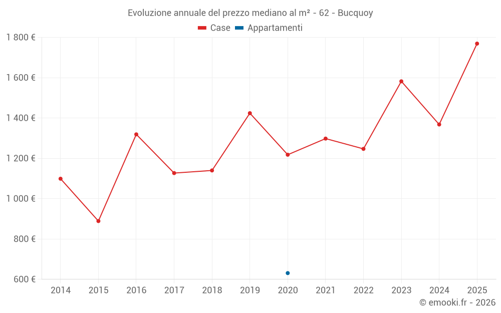 Il prezzo mediano sulle 30 transazioni di case degli ultimi 24 mesi nel comune di Bucquoy era di 1 392 € al metro quadrato per un valore patrimoniale mediano di 134 690 €. In questo periodo il 60% delle transazioni era tra 917 e 1 734 € al metro quadrato (dal 2° all'8° decile).