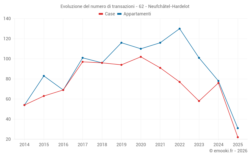 Il prezzo mediano sulle 31 transazioni di appartamenti degli ultimi 6 mesi nel comune di Neufchâtel-Hardelot era di 5 958 € al metro quadrato per un valore patrimoniale mediano di 254 000 €. In questo periodo il 60% delle transazioni era tra 4 794 e 6 508 € al metro quadrato (dal 2° all'8° decile).