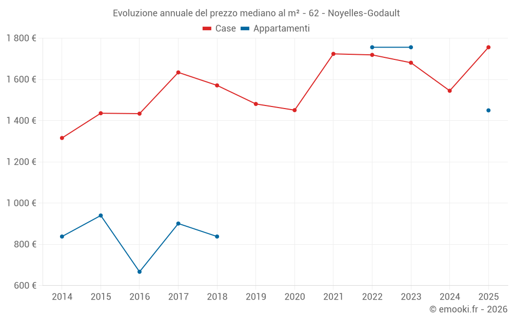 Il prezzo mediano sulle 38 transazioni di case degli ultimi 12 mesi nel comune di Noyelles-Godault era di 1 654 € al metro quadrato per un valore patrimoniale mediano di 139 500 €. In questo periodo il 60% delle transazioni era tra 1 272 e 2 160 € al metro quadrato (dal 2° all'8° decile).