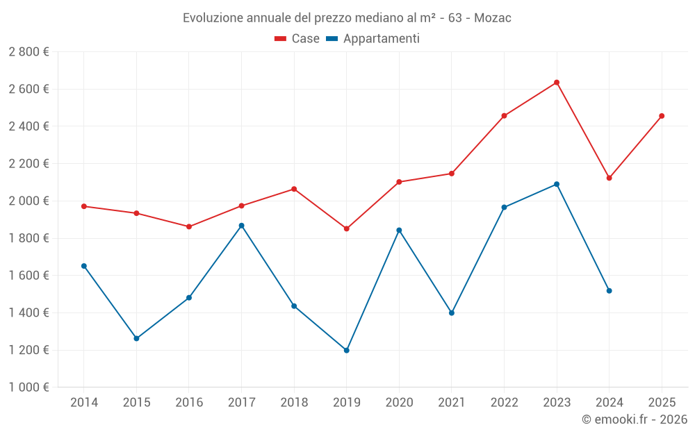 Il prezzo mediano sulle 32 transazioni di case degli ultimi 12 mesi nel comune di Mozac era di 2 434 € al metro quadrato per un valore patrimoniale mediano di 241 144 €. In questo periodo il 60% delle transazioni era tra 2 075 e 2 903 € al metro quadrato (dal 2° all'8° decile).