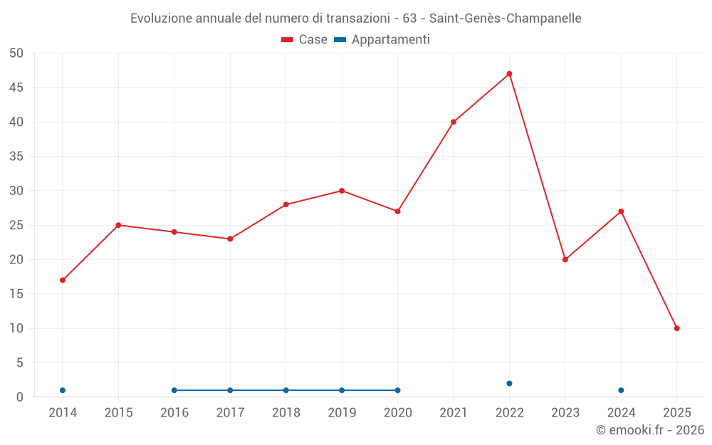 Il prezzo mediano sulle 27 transazioni di case degli ultimi 12 mesi nel comune di Saint-Genès-Champanelle era di 2 152 € al metro quadrato per un valore patrimoniale mediano di 210 550 €. In questo periodo il 60% delle transazioni era tra 1 275 e 2 865 € al metro quadrato (dal 2° all'8° decile).