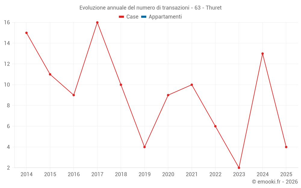 Il prezzo mediano sulle 19 transazioni di case degli ultimi 24 mesi nel comune di Thuret era di 1 752 € al metro quadrato per un valore patrimoniale mediano di 178 600 €. In questo periodo il 60% delle transazioni era tra 1 146 e 2 275 € al metro quadrato (dal 2° all'8° decile).