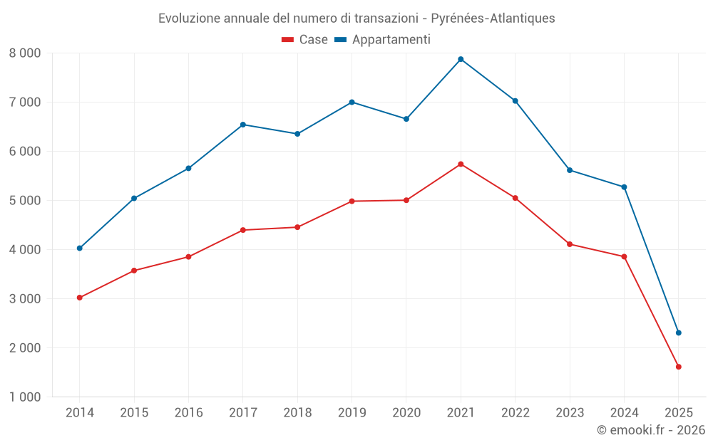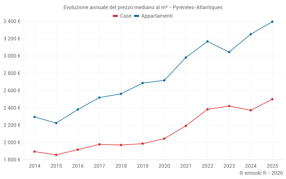 Il prezzo mediano sulle 679 transazioni di case degli ultimi 3 mesi nel dipartimento di Pyrénées-Atlantiques era di 2 583 € al metro quadrato per un valore patrimoniale mediano di 295 000 €. In questo periodo il 60% delle transazioni era tra 1 617 e 4 849 € al metro quadrato (dal 2° all'8° decile).