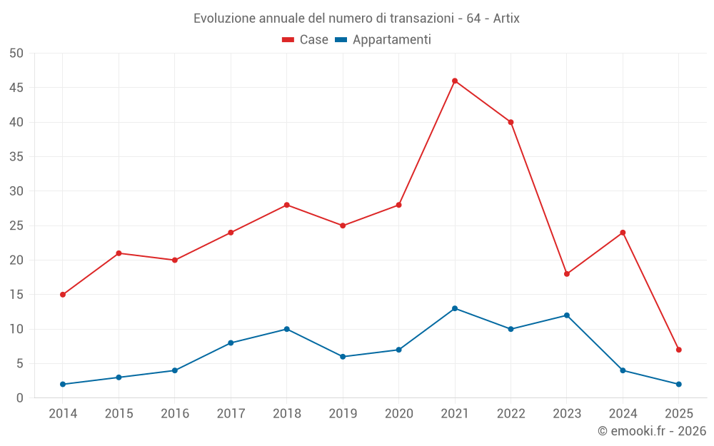 Il prezzo mediano sulle 21 transazioni di case degli ultimi 12 mesi nel comune di Artix era di 1 759 € al metro quadrato per un valore patrimoniale mediano di 162 750 €. In questo periodo il 60% delle transazioni era tra 1 433 e 2 174 € al metro quadrato (dal 2° all'8° decile).