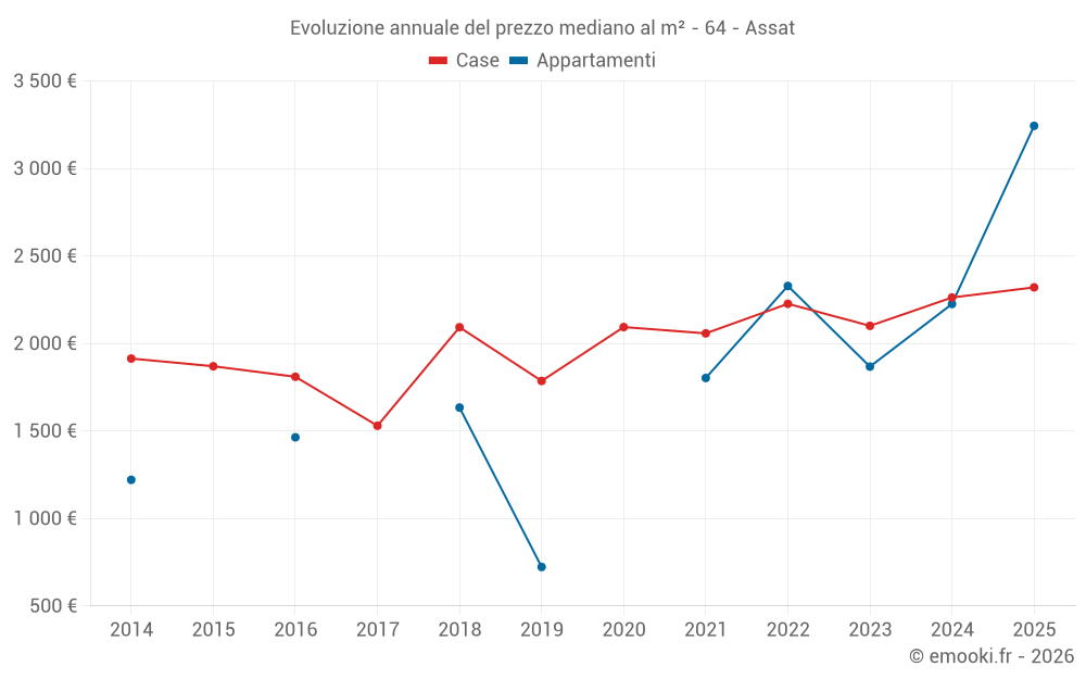 Il prezzo mediano sulle 20 transazioni di case degli ultimi 12 mesi nel comune di Assat era di 2 254 € al metro quadrato per un valore patrimoniale mediano di 229 760 €. In questo periodo il 60% delle transazioni era tra 1 865 e 3 026 € al metro quadrato (dal 2° all'8° decile).