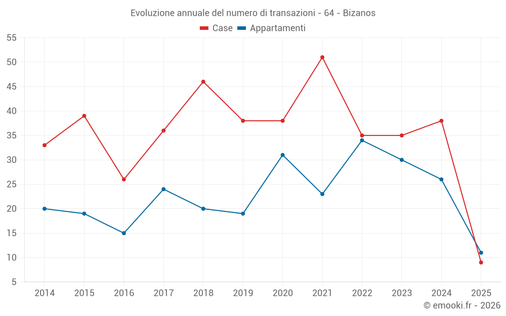 Il prezzo mediano sulle 31 transazioni di case degli ultimi 12 mesi nel comune di Bizanos era di 2 648 € al metro quadrato per un valore patrimoniale mediano di 262 500 €. In questo periodo il 60% delle transazioni era tra 2 145 e 2 831 € al metro quadrato (dal 2° all'8° decile).