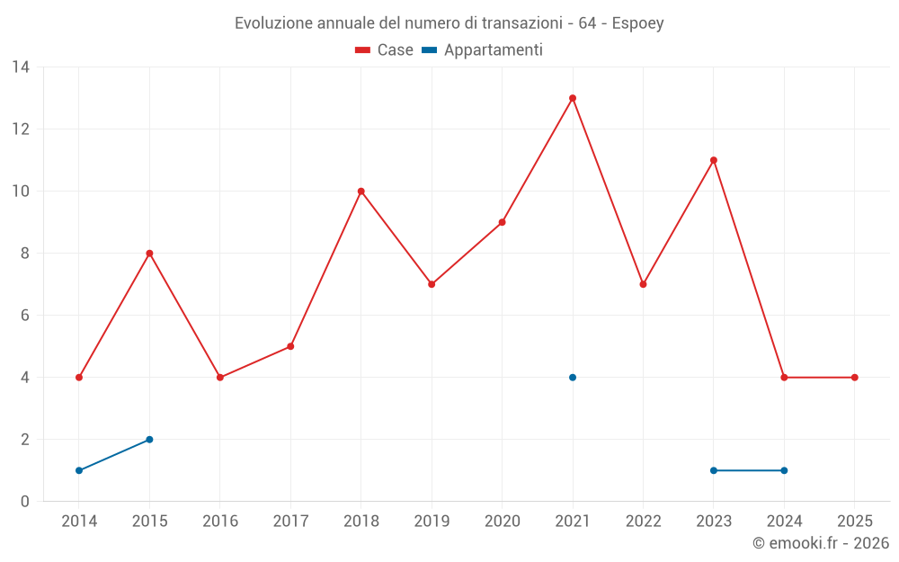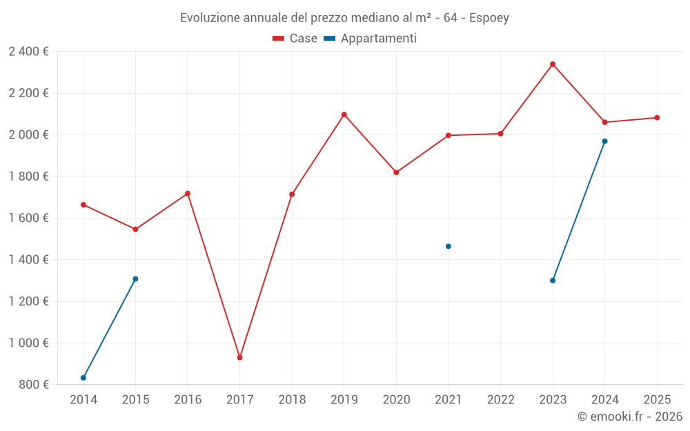Il prezzo mediano sulle 14 transazioni di case degli ultimi 24 mesi nel comune di Espoey era di 2 100 € al metro quadrato per un valore patrimoniale mediano di 257 050 €. In questo periodo il 60% delle transazioni era tra 1 781 e 2 820 € al metro quadrato (dal 2° all'8° decile).