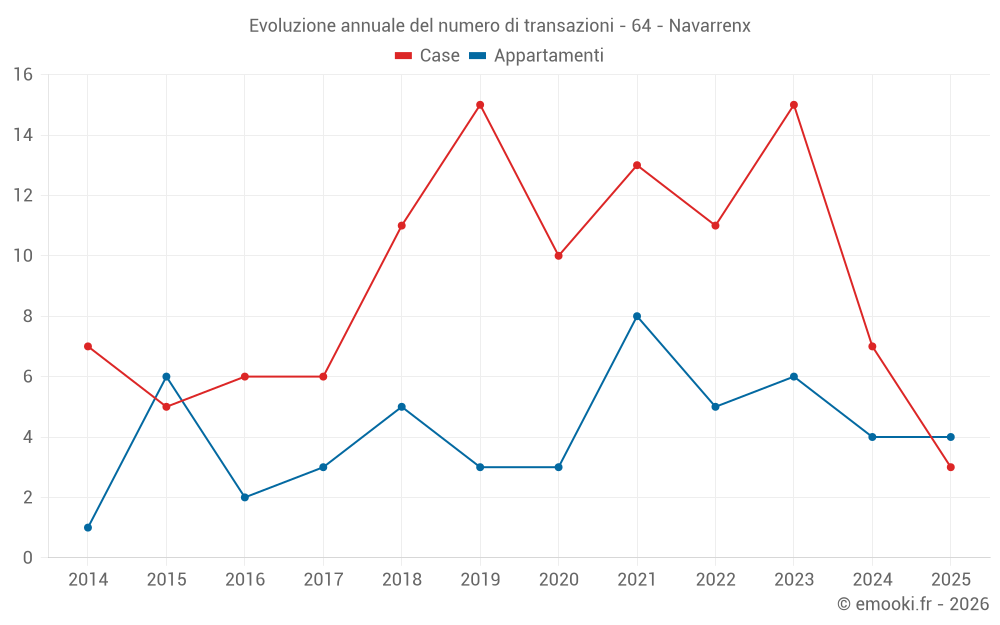 Il prezzo mediano sulle 16 transazioni di case degli ultimi 24 mesi nel comune di Navarrenx era di 1 766 € al metro quadrato per un valore patrimoniale mediano di 169 000 €. In questo periodo il 60% delle transazioni era tra 1 084 e 2 037 € al metro quadrato (dal 2° all'8° decile).
