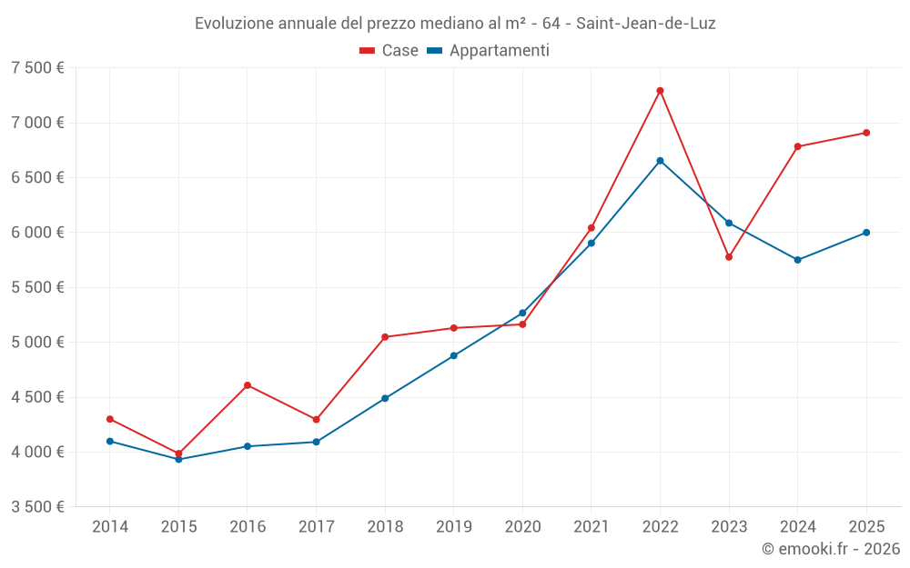 Il prezzo mediano sulle 26 transazioni di case degli ultimi 6 mesi nel comune di Saint-Jean-de-Luz era di 6 909 € al metro quadrato per un valore patrimoniale mediano di 734 000 €. In questo periodo il 60% delle transazioni era tra 3 683 e 8 864 € al metro quadrato (dal 2° all'8° decile).