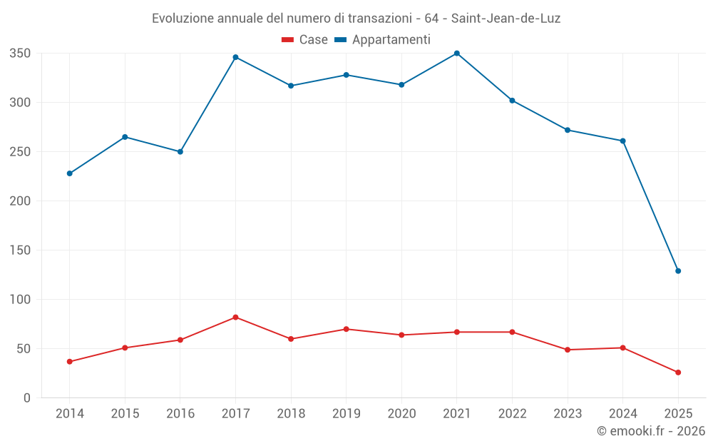Il prezzo mediano sulle 64 transazioni di appartamenti degli ultimi 3 mesi nel comune di Saint-Jean-de-Luz era di 5 890 € al metro quadrato per un valore patrimoniale mediano di 305 100 €. In questo periodo il 60% delle transazioni era tra 4 886 e 7 383 € al metro quadrato (dal 2° all'8° decile).
