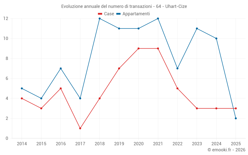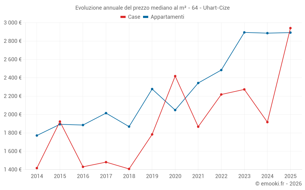 Il prezzo mediano sulle 21 transazioni di appartamenti degli ultimi 24 mesi nel comune di Uhart-Cize era di 2 894 € al metro quadrato per un valore patrimoniale mediano di 92 000 €. In questo periodo il 60% delle transazioni era tra 2 581 e 3 032 € al metro quadrato (dal 2° all'8° decile).