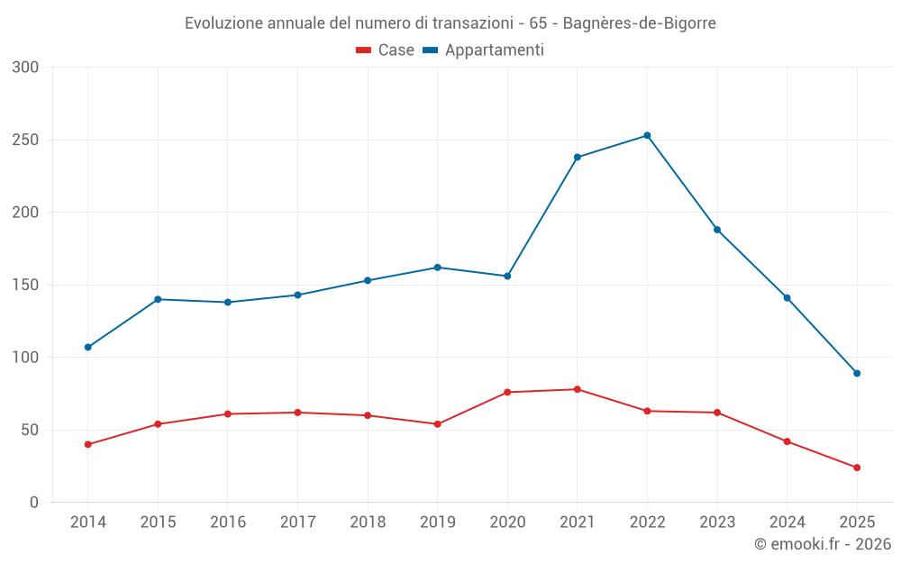Il prezzo mediano sulle 51 transazioni di appartamenti degli ultimi 3 mesi nel comune di Bagnères-de-Bigorre era di 1 750 € al metro quadrato per un valore patrimoniale mediano di 85 890 €. In questo periodo il 60% delle transazioni era tra 1 047 e 2 497 € al metro quadrato (dal 2° all'8° decile).